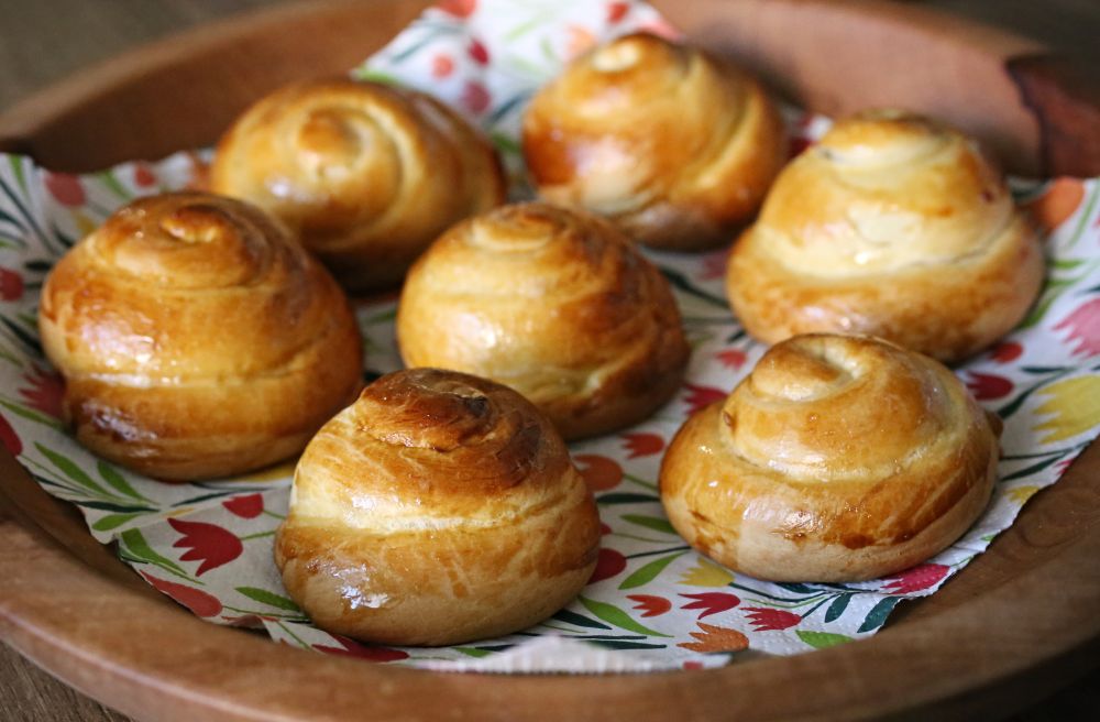 Z těsta navážíme kousky o váze 80 g, vyválíme je do asi 20 cm dlouhých válečků. Stočíme je do spirály a konec schováme pod těsto, aby se nerozmotaly. Spirály neutahujeme, jinak v troubě vyběhnou moc do výšky.